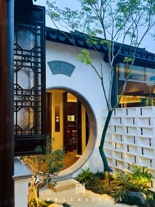 繞過(guò)門廳,可以見(jiàn)到一個(gè)月洞門小院。通過(guò)一棵飄逸的楓樹(shù)和月洞門形成了一個(gè)框景。月亮對(duì)于我們中國(guó)人可以說(shuō)是情有獨(dú)鐘。